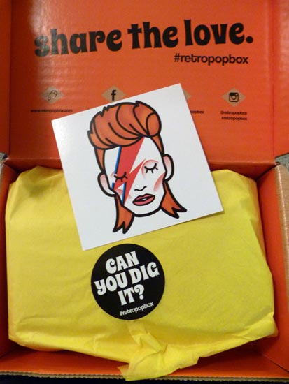 When I opened up the box, this sticker was laying on top. Emotions of sadness overwhelmed me, then of happiness having this cool sticker. RetroPopBox really wanted to put a Bowie tribute in the box to celebrate his life and career. "We all loved Bowie!!" I think it's awesome.